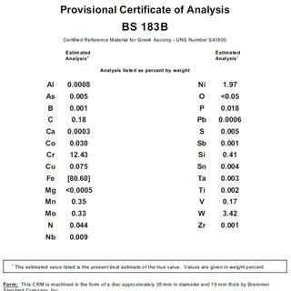 Sono da oggi disponibili i nuovi materiali di riferimento certificati per acciai inossidabili 418 (Greek Ascoloy) prodotti dalla Brammer Standard. I campioni, per ora accompagnati da certificato provvisorio, sono disponibili in forma di disco di dimensioni ø38x19mm nei due lotti 183B e 183C.